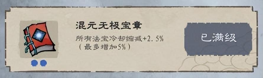 混元无极宝章--所有法宝冷却缩减+2.5%,(满级增加5%)所有可以触发技能的法宝都可享受减CD效果。