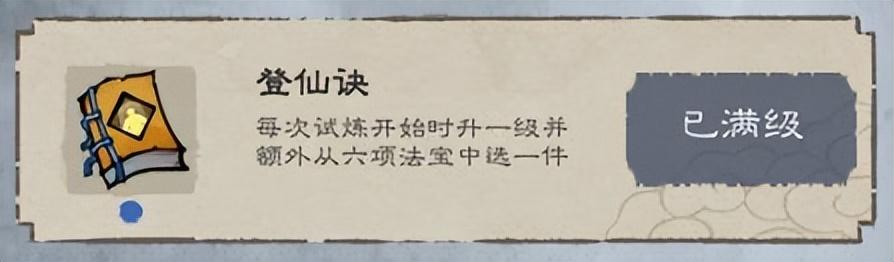登仙诀--每次试炼开始时升一级并额外从六件法宝中选一件。(说白了就是开局可选择一次法宝)