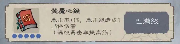 焚魔心经--暴击率+1%,暴击能造成1.5倍伤害(满级暴击率提高5%)