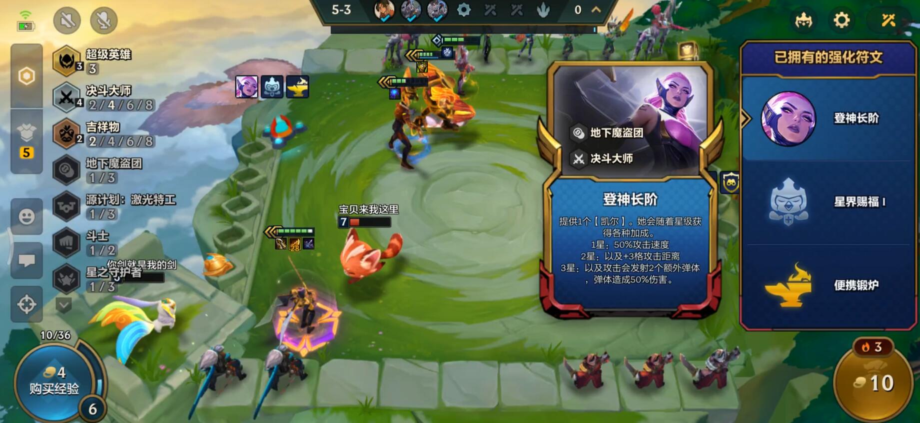 搭配3超级英雄,基础增伤20%,每多一个三星英雄,额外增伤5%。因此,除了凯尔之外,尽量多追几个三星之后,再拉人口等级。