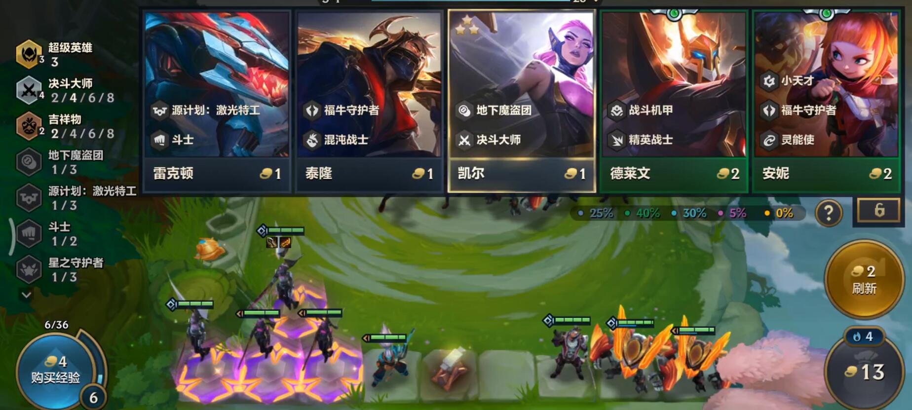 前三波野怪如果能获得金币,那么,在三人口可以D一波,三人口刷一费卡的概率高达75,运气好的话,十金币可以获得四五张自己需要的一费卡。然后积攒到50金币慢D,当然,也有玩家喜欢50金币梭哈一波,快速刷到三星凯尔来锁血。不过,这种操作风险也比较大,能出三星凯尔还好,可以通过刷连胜来快速将金币挣回来。如果50金币刷完也出不来,那么就意味着每个回合要少5金币的收益,有了三星凯尔之后,也无力提升人口等级了。
