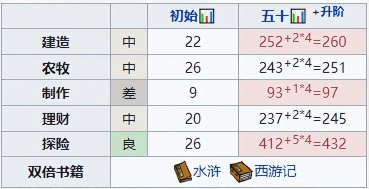 满级属性:建造260,农牧251,制作97,理财245,探险432。