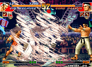 AE版:相比拳皇96增加了特殊技,加了一些必杀超杀,系统也改成爆气可以取消连段等等。