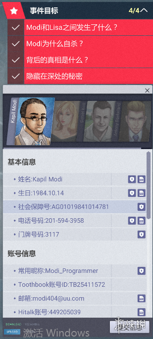 第二个推理步骤为:骚扰—两个都是—面临破产。点击伪装和女主人对话步骤为两次恐吓和询问,点击4次婚姻、订制服务、Antony,然后和婚恋网打电话,结束后点击对方说的最后一句话得到网址,接着入侵服务器,输入网址,动态码随机的,输入就行,点击第一个文档收集后退出。