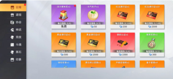 日常商店:除每天领取免费体力外,一些特殊道具(御前认证、熔核)和限购,值得入。