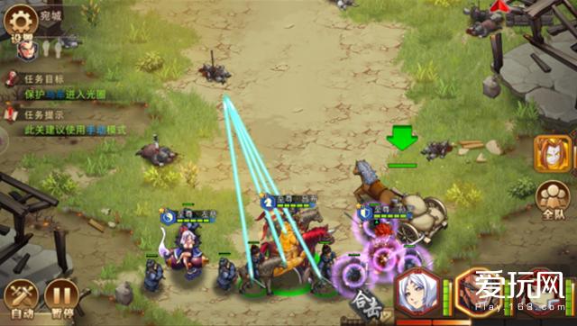 说到英杰传,不少人第一时间想到的肯定是经典战棋游戏三国志英杰传,大家会想当然的以为这是一款战棋游戏。不过真正进入到战斗之后,事实却并非如此。《全民英杰传》采用的是一种类似RTS的战斗方式,玩家将会带三名将领参加战斗,每个将领为一个单位,战斗中玩家需要操控将领进行走位,可以全体拖动,也可以单个拖动或者点击,不同的手势有不同的含义。每个英雄都各自拥有技能,不同的英雄搭配存在合击属性——这就又关联到了阵容配置。
