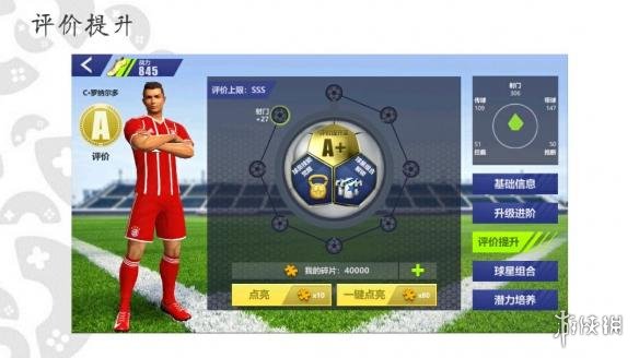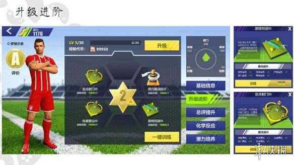 光有高阶的评价还不够,球员还要给自己升级属性。例如罗纳尔多的定点射门和游戏对战属性,可以通过训练来进行提升,提升后的球员抢断、射门和传球等属性都会更加强大,在赛场上能以属性优势领先你的对手!所以技能属性的升级进阶非常重要,各位玩家感觉自己不够强的话,一定要去升级一下球员的技能属性哦!