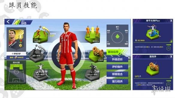 除此之外,球员的技能也是可以升级的。技能等级越高优势也就越大,例如罗纳尔多的“单干大神”技能在升级进阶后可增加30点的传球属性和射门属性,如果双方玩家技术水平难分高下,这30点的属性或许就能决定他们的胜负了,所以可以升级的时候可千万别忘了他。