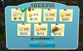 而且QQ会员还有10%的额外加成。签到第三天赠送58钻石,签到第七天赠送108钻石,签到第11天赠送288钻石,签到第14天赠送588钻石。只要连续签到,钻石神马的还是不成问题的。