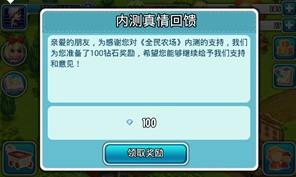 为了感谢玩家对《全民农场》内测的支持,还赠送了玩家100钻石的额外奖励。前期可以尽情去玩了。