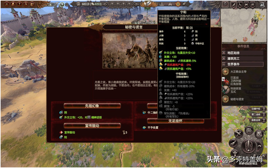 游戏过程中,围绕主线会展开一些列任务,带有一定的教学性质在其中,当玩家完成后可以获得一定的奖励。此外,玩家会遇到各种各样的随机事件,让游戏的过程变得饱满且有趣,随机事件往往需要玩家做出选择,选择的结果会在一定程度上影响游戏中的金钱、暴乱值、阴阳等。