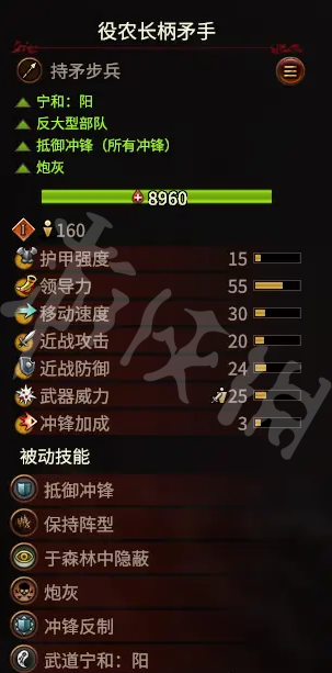 役农长柄矛手,老农矛,单看面板有点平平无奇,15护甲等于纸糊,吃满宁和也就36近防,而且这个兵几乎只在没有兵营的情况下才会拉出来作数的,可以说是中规中矩的炮灰,亮点是这玩意竟然有抵御全冲锋,而且吃满宁和的情况下士气是比较稳固的,不会出现被放血鬼a上来没几秒就溃了的情况,但也千万不要指望这个兵种能打出什么作用。主要适用环境为15-20回合前震旦内战,建议用于攻城时站点和绞肉。
