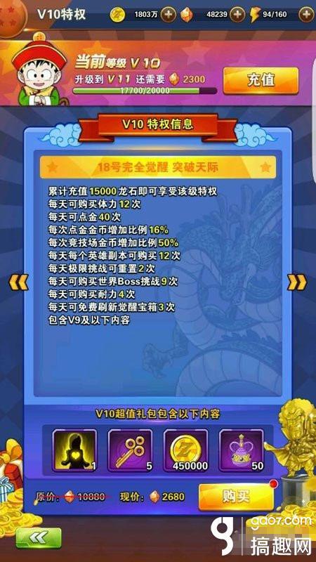 龙珠激斗游戏中,玩家累积充值15000龙石即可达到V10,每天可以购买体力12次,点金40次,点金金币增加16%,竞技场金币增加50%。每天每个英雄副本可购买12次,极限挑战充值2次,世界BOSS可购买9次,购买耐力4次,免费刷新觉醒宝箱3次。