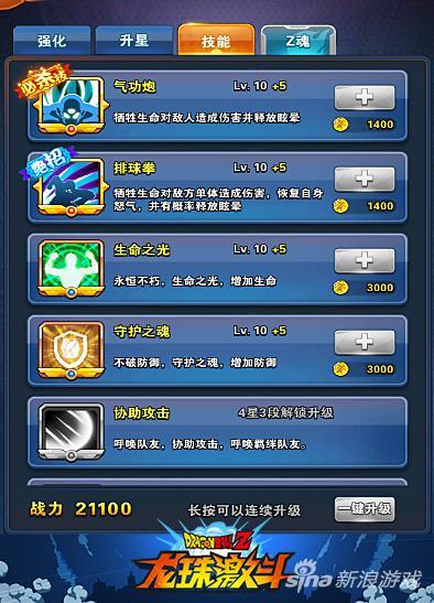 概述:气功炮是天津饭凝聚全身能力释放出的气功冲击,威力无与伦比,但十分消耗体力。牺牲自身10%当前生命,对敌方竖排造成(物理攻击*108%+1800)点物理伤害并释放眩晕1回合:无法行动,并无法格挡。