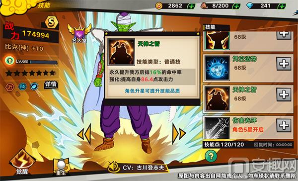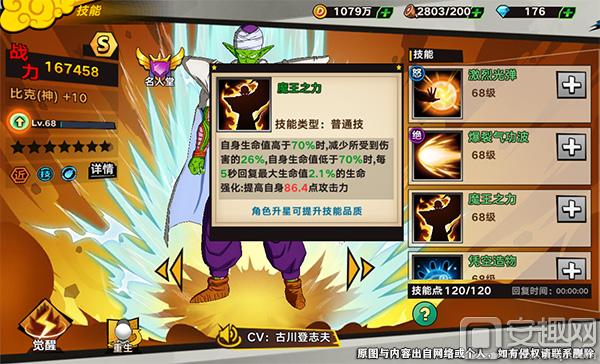 比克(神)在游戏中的地位是纯输出单位,单次计算、必中的直线伤害技能让他的输出效率远高于其他角色;“魔王之力”、“凭空造物”两个BUFF类技能让自身拥有一定的续航能力;高阶解锁的被动技“天神之智”还永久为我方后排角色提升命中率,这个效果简直完美还原了动画中他智慧其他Z战士战斗的细节。