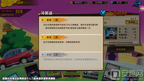 在《龙珠觉醒》中,北界王将作为伙伴单位登场,只要在战斗中发动怒气技便有70%几率发动他的招牌技能“冷笑话”,封杀对方的怒气技!虽然时效只有短短3秒,但在游戏后期的战斗中,双方经常在半血时互丢大招,我方即使不死也是半残,很多时候关卡的3星保障(无人死亡)就是在此时丢失的!这个时候只要能尽早发动北界王的技能,就足以让我方人员用完所有怒气技,完成一波推了。