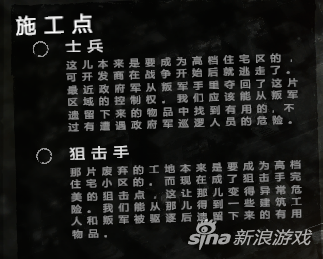 施工点(Construction Site):剧情一:狙击手,有两个士兵,一个拿狙击枪,一个拿步枪,第一次去的时候地下室不能下去,要等第二次去的时候带上一个锯子,右边三楼有一个上锁的柜子。大量的电子元件与药品,还有食物,物资比较丰富。