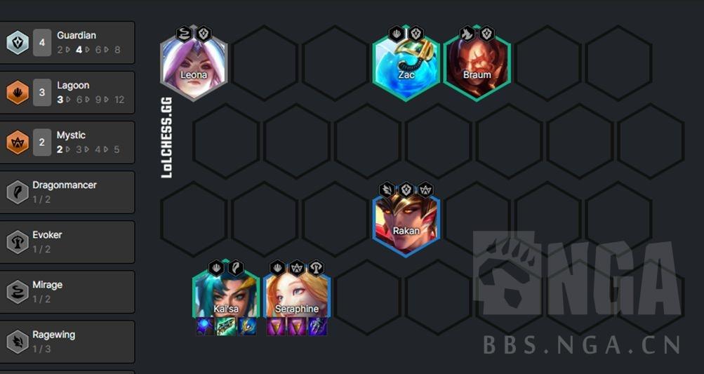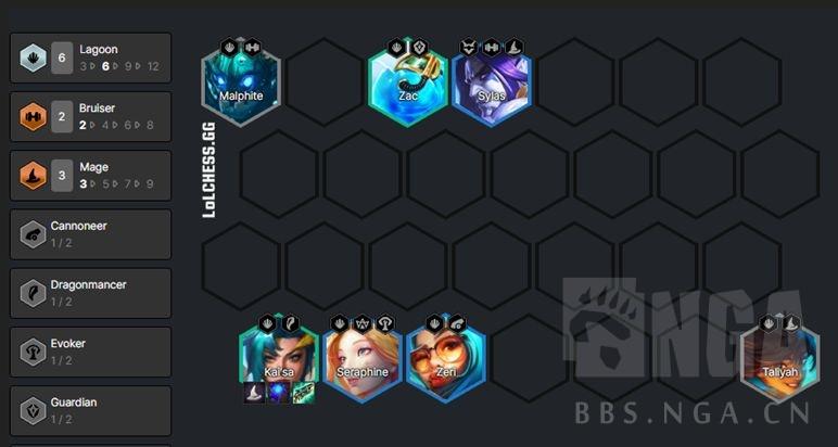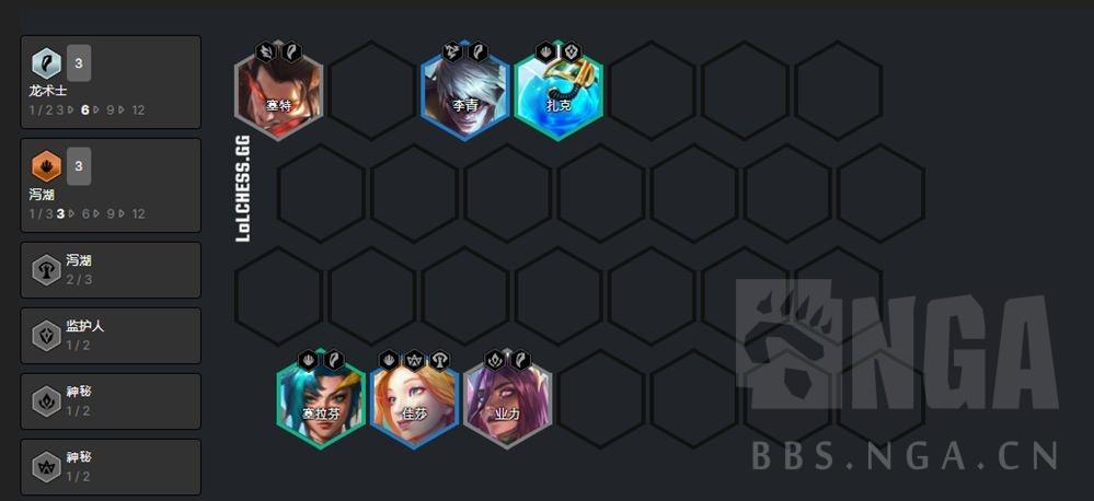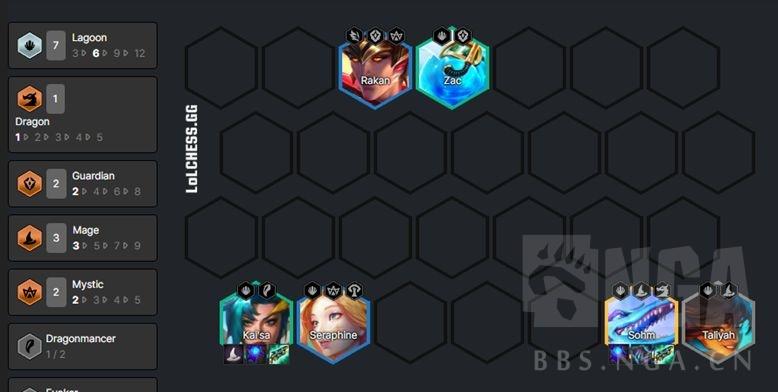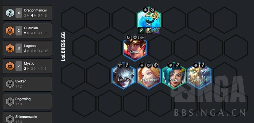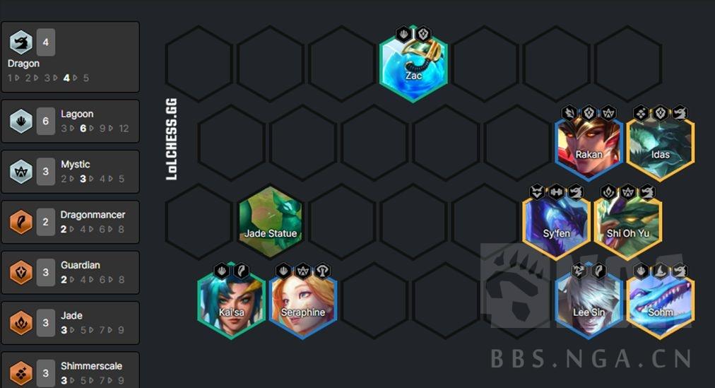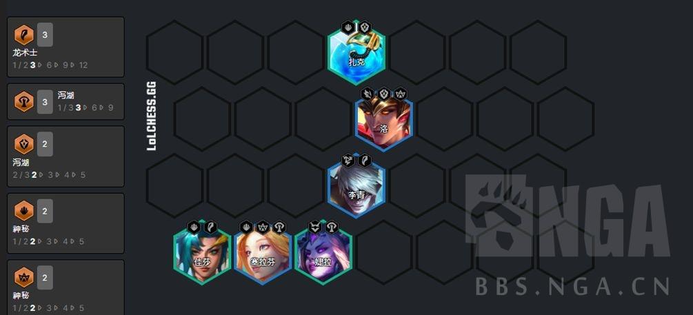 如果有神龙转,可以视扎克数量考虑玩扎克主C,阵容可以保持和4护卫卡莎一样不变,也可以按下图上4神龙。