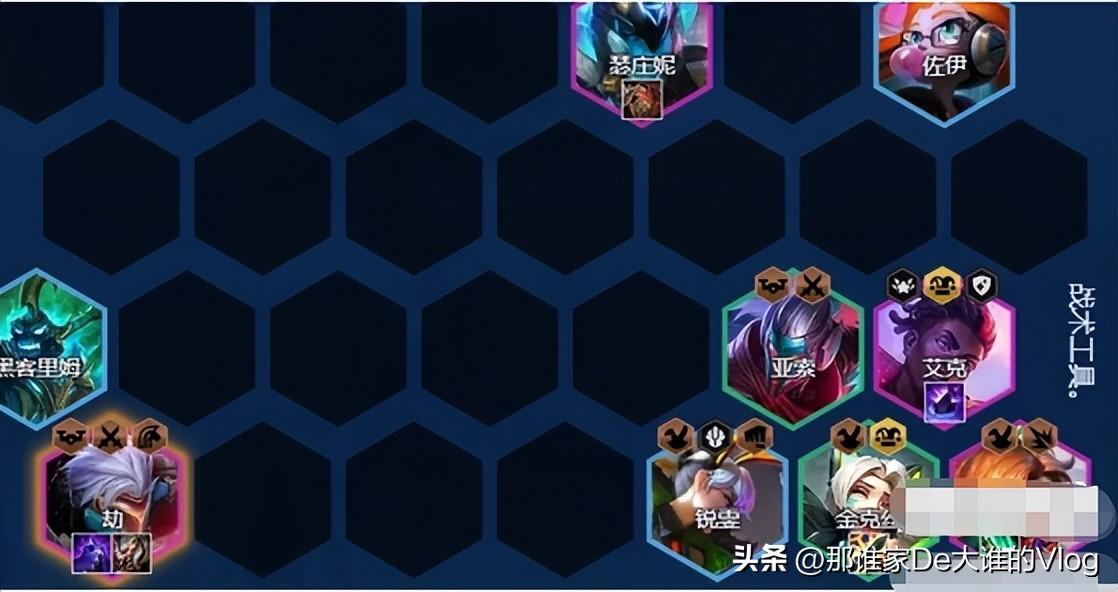 1、棋子组成:劫、女枪、佐伊、艾克、猪妹、瑞雯、亚索、金克斯。
