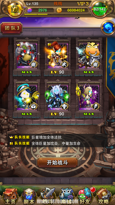 说一下我的思路:以卡牌自身组合法抗代替队长技能,基友小新方便过本,观察BOSS法功后排,除了PDS外选择自带法抗且血量较厚的奶。4小怪均为物攻,1、3号位选择物抗T。阵容如下图所示: