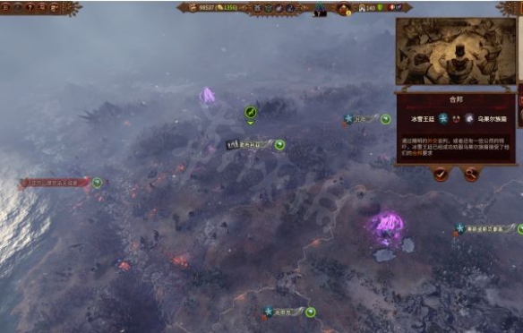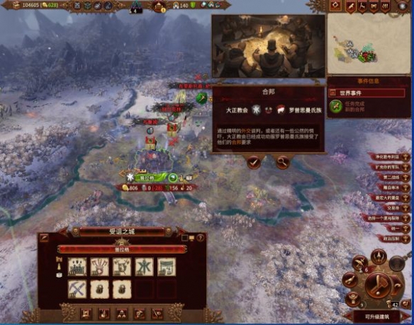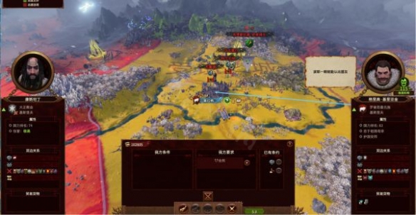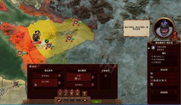 我们等罗普斯满氏族军队全灭的时候即可无条件合帮其实这时候我一座城都没有,是靠着和他防御同盟待在他的领地里苟活。