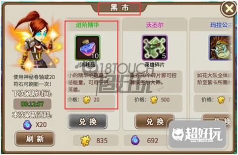 黑市几乎每次都会刷新出进阶精华,2万能碎片/个。通常是按组出售,10个、50个、100个一组。前中期很稀缺的东西,建议大家把握好两小时刷新一次的黑市,看到了就买,碎片不够分解英雄买!