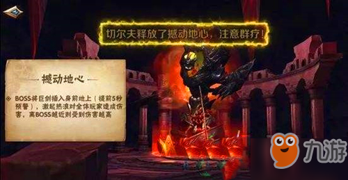 撼动地心结束后,小队要立即回到boss跟前 ,提防boss使出火焰冲击 !若第一仇恨不在近战范围,则对该仇恨玩家造成中量伤害 ,并附带着加热debuff ,玩家受到火焰冲击伤害加倍 。