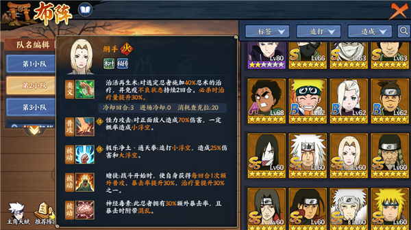 后排是游戏里最安全的位置,因此后排放置的忍者也需要玩家灵活应变。通常情况下可以放辅助型忍者,拥有驱散和回血两种技能的,例如纲手,纲手的奥义可以给小队忍者回血并免疫不良状态,轻松解决小队忍者被控制而无法出手的尴尬局面。其次在对手实力较强的情况下,可以将脆皮或小队追打核心的忍者放置在后排,也算是防守反击的阵容搭配。这样的站位选择,可以让忍者有安全的输出环境,提高小队整体输出能力。