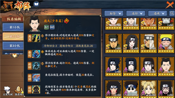 中排是游戏里相对前排来说,比较安全的位置了,只要前排不倒下,中排就不会有太多的危险。因此中排通常情况下都放置输出和控制型忍者,控制忍者放在2手位,这样方便快速出手,例如鹿丸。鹿丸的奥义拥有定身效果,进场直接奥义控制敌方关键输出位置。3-4手位可以放置输出忍者,例如宇智波鼬,强大的忍术伤害,快速消耗敌人生命值。在没有控制忍者的情况下,中排全选输出忍者,增强小队的伤害。