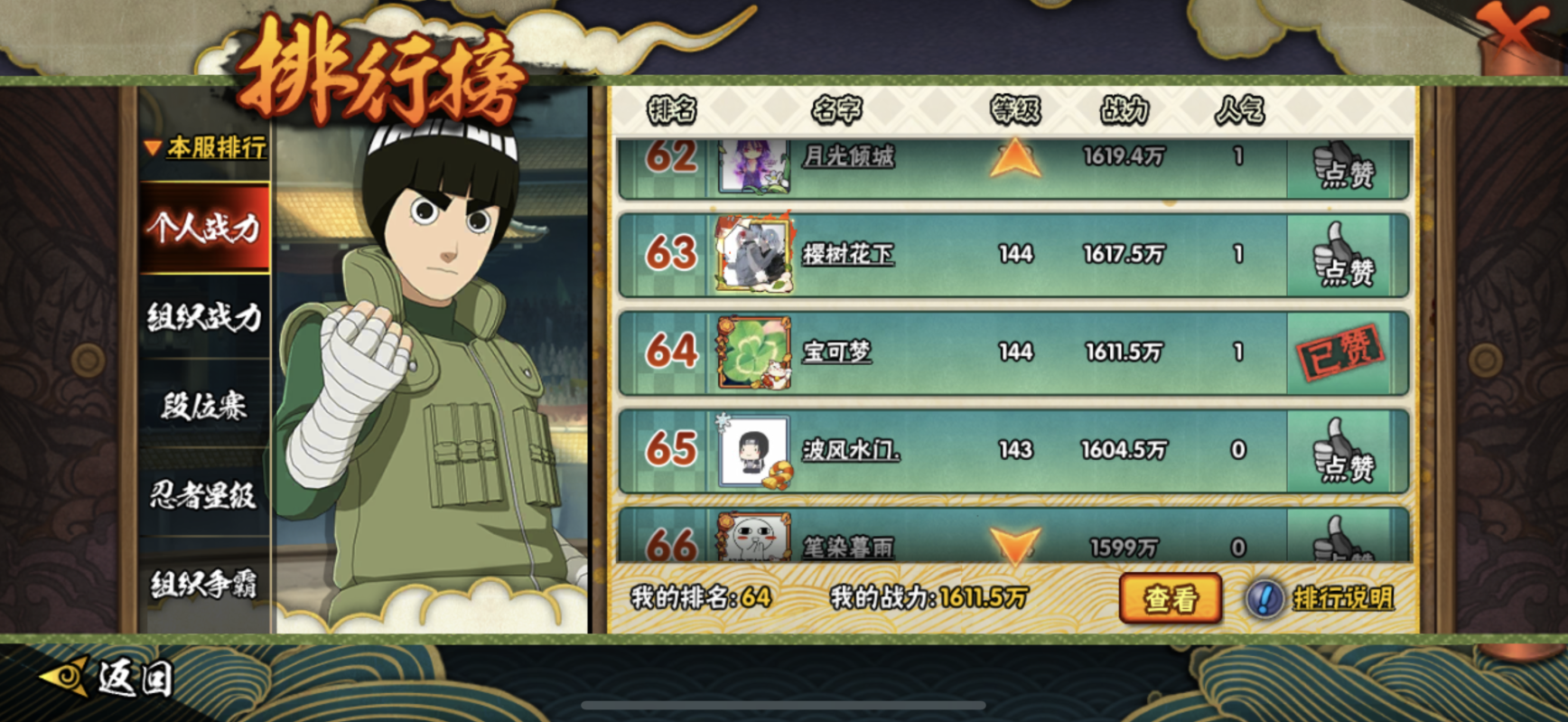 先说说自己的看法。战力系统是一些氪星玩家比较关心的,但是一些服务器的每一个第一绝对是氪星大佬。没有一个月卡玩家敢说自己能保第一,这个不太现实。除非你所在的服务器是幽灵区,其他的都没了,你才会有一定概率升到榜首,但这一点都不好玩吧?所以,你得先意识到一个问题。普通玩家和月卡玩家不要总和排行榜前的那些玩家比,没有意义。虽然你可以通过攒金币获得和他们一样的高技能忍者,但是氪造成的战力差异还是非常明显的,这是高活跃度无法弥补的。