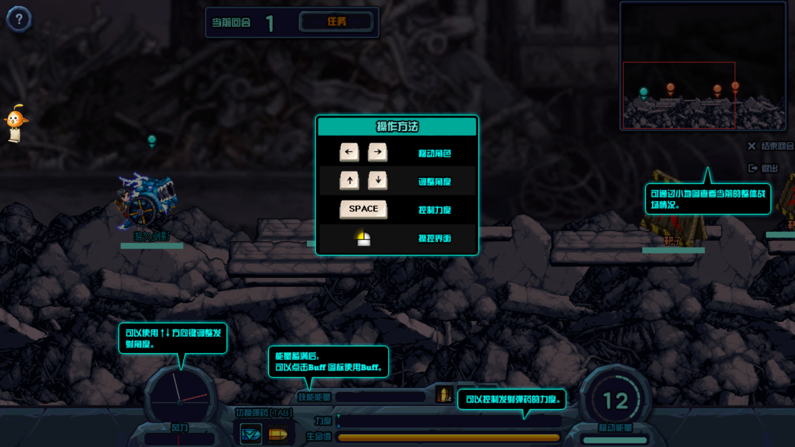 基础操作,左右键控制炮台左右移动,上下键控制发射炮弹角度,空格键控制炮弹发射力度,对是对于评分赛来说,只需要发射最大力度。