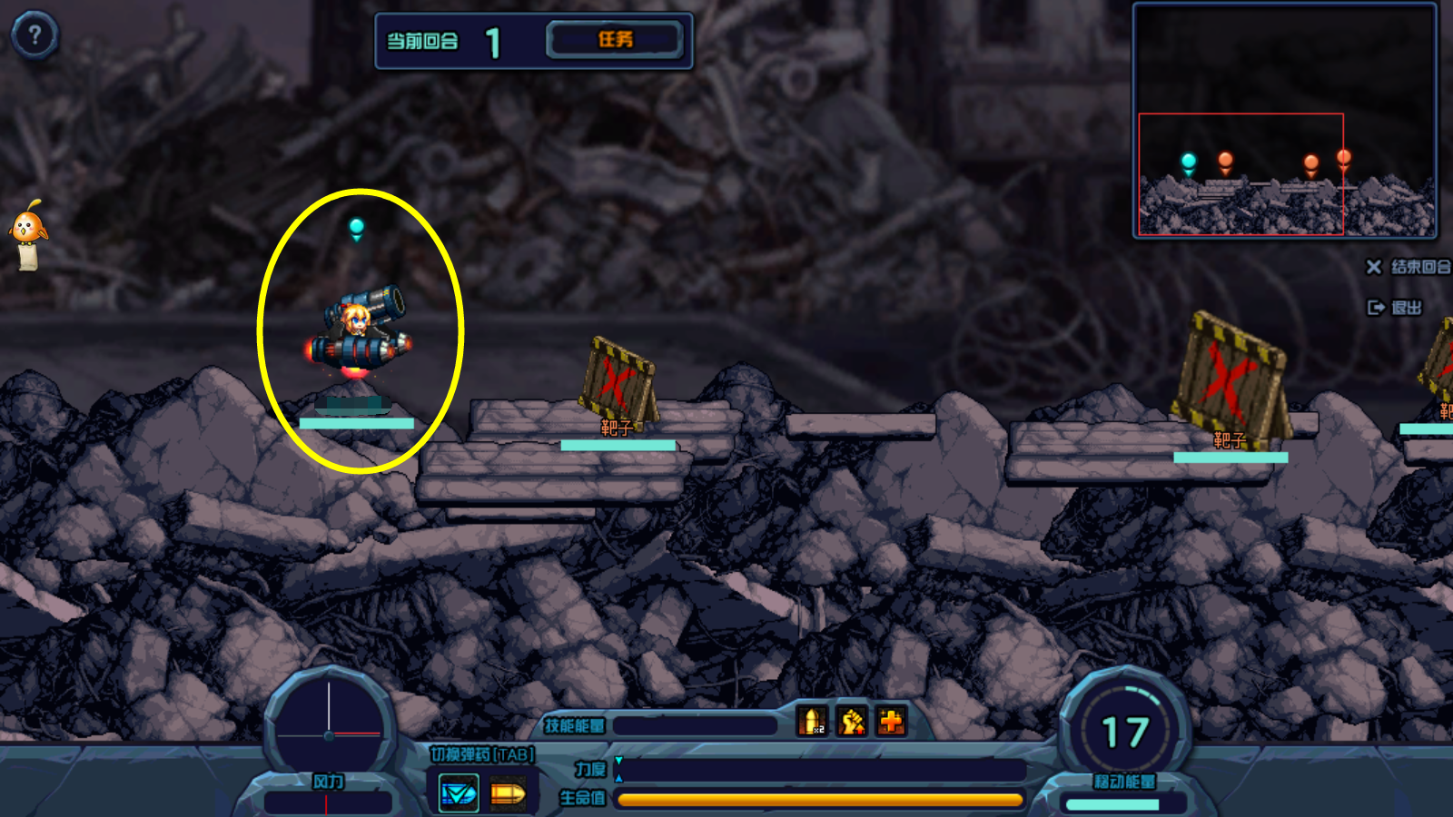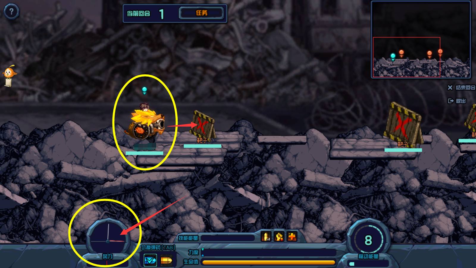 其实也很简单,同样用我们前面说的水平法,第一个靶子很小,我们需要将炮台移动到右边的小坡上,因为有个坎,我们是上不去的,指针只要处于正水平线位置,那么就能一炮打中第一个靶子的中心,所以技能条涨很快,在第四回合时就能使用技能,这样也可以控制在五个回合内通关。