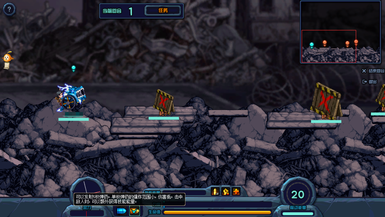 每回合20秒的时间,发射炮弹即视为一个回合,倒计时结束没发射也算一个回合,而评分赛需要玩家在5个回合内打完一大一小的靶子才能拿到S级评分。大多数情况下第五回合的时候技能能量涨满,可以点击升级下一回合的技能,比如第一个双重发射,第二个增伤50%,第三个回复自己的生命值,这些功能在常规赛和玩家对抗才需要,我们做评分赛攻略,这些东西完全不需要去了解。