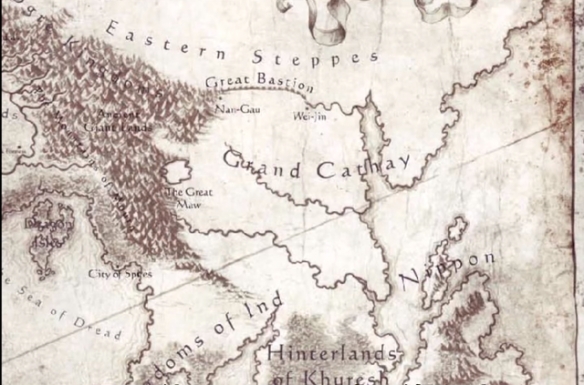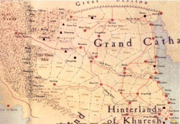 震旦帝国的北边是信仰混沌的游牧民族,西边是食人魔的悲恸山脉,再往西是混沌矮人的黑暗之地,黑暗之地再往西就是凡世帝国的边缘山脉了。