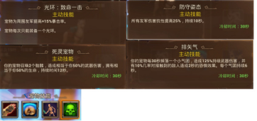 格挡率没满40%就用【光环:增强感知】,全体友军提供10%格挡率。满了就选【光环:致命一击】,全体友军提高15%暴击率;【防守姿态】提高所有伤害抗性25%;【死灵宠物】召唤骷髅,召唤出来的小弟越多(上限五个小弟),【奉献】赋予的增伤效果越高;【排矢气】毒气团,赋予敌人恐惧异常效果,具体啥效果咱也不知道