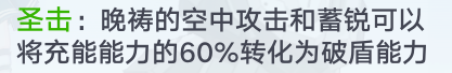 由于晚祷普攻时有被动【圣击】存在,即在晚祷的空中攻击和蓄锐攻击时,会将充能能力的60%转化为破盾能力,也就是在空中和蓄锐攻击时,晚祷的破防数值是16,而充能只有4点。