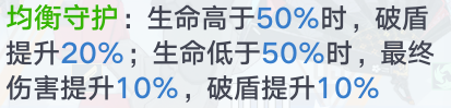 均衡守护的效果是人物生命高于50%时,破盾能力提升20%;生命低于50%时,最终伤害提升10%,破盾提升10%。只要能保证血量50%以上,破盾能力就会始终提升最高的20%。(很多副本只要我们自身实力不是很差,治疗也不偷懒的话,血量基本上都能维持在50%以上)
