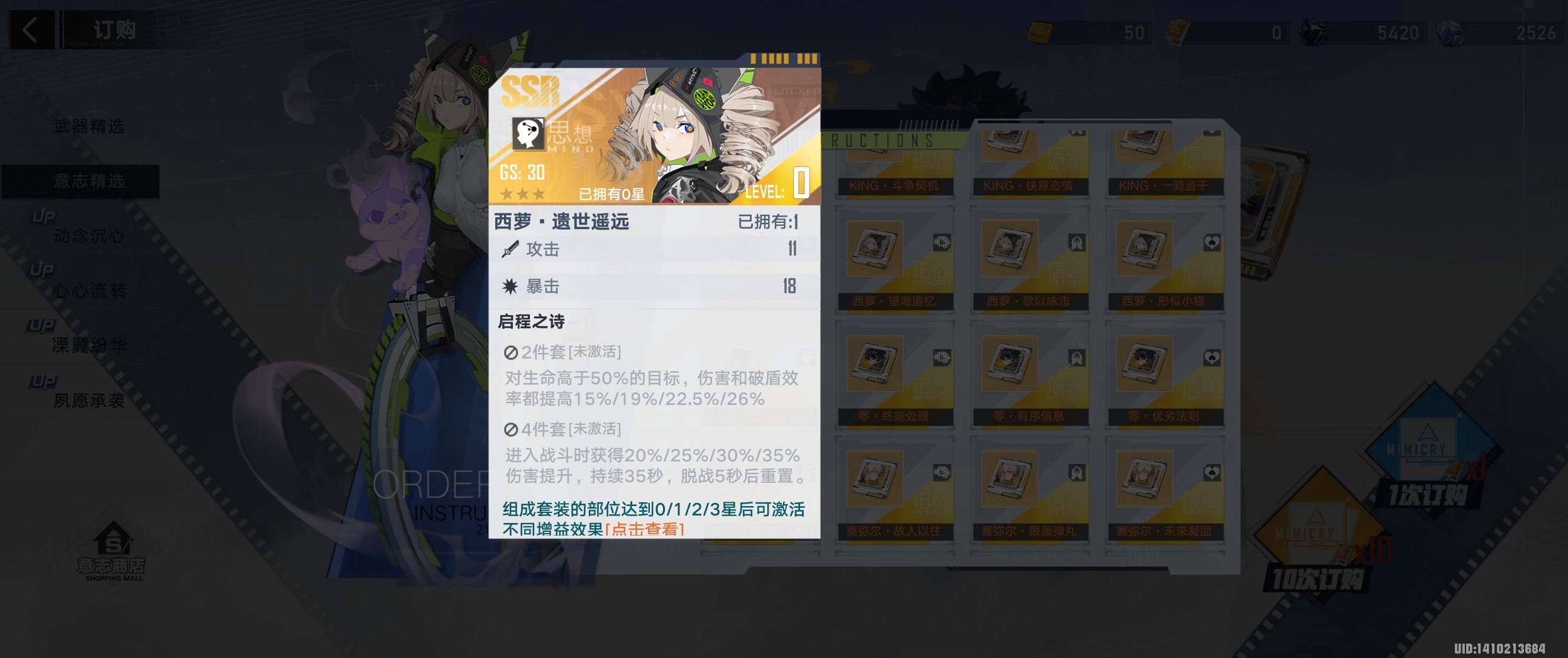 4件套时,装备意志的武器进入战斗后伤害会提高,持续35秒,但是需要脱战5秒后才能重置。这就意味着,手持装备了4西萝的武器,需要不断被切换到后台,才能不断重置4件套的效果,这显然是不符合主场武器的常驻要求的,因此副C或者拐类这种上阵时间不长的武器,反而更适合西萝。