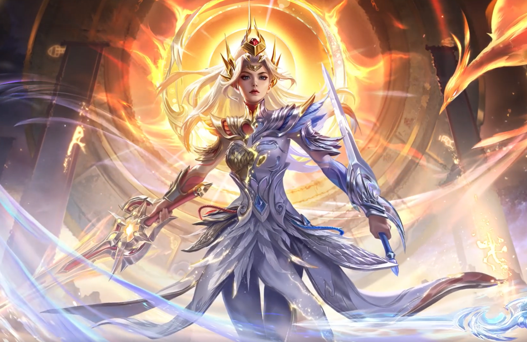 该皮肤主题为“九霄神明”,皮肤命名为“九霄神辉”,日月交替的效果完美诠释了皮肤中的两种形态,身上的战甲象征着她曾经是人类的将军,海报上,身着的服装也是日月交辉,蓝色代表着沉稳的月,红色代表着火辣的日,手持双剑,那叫一个飒,皮肤为古风玄幻,不知道大家是否喜欢呢?