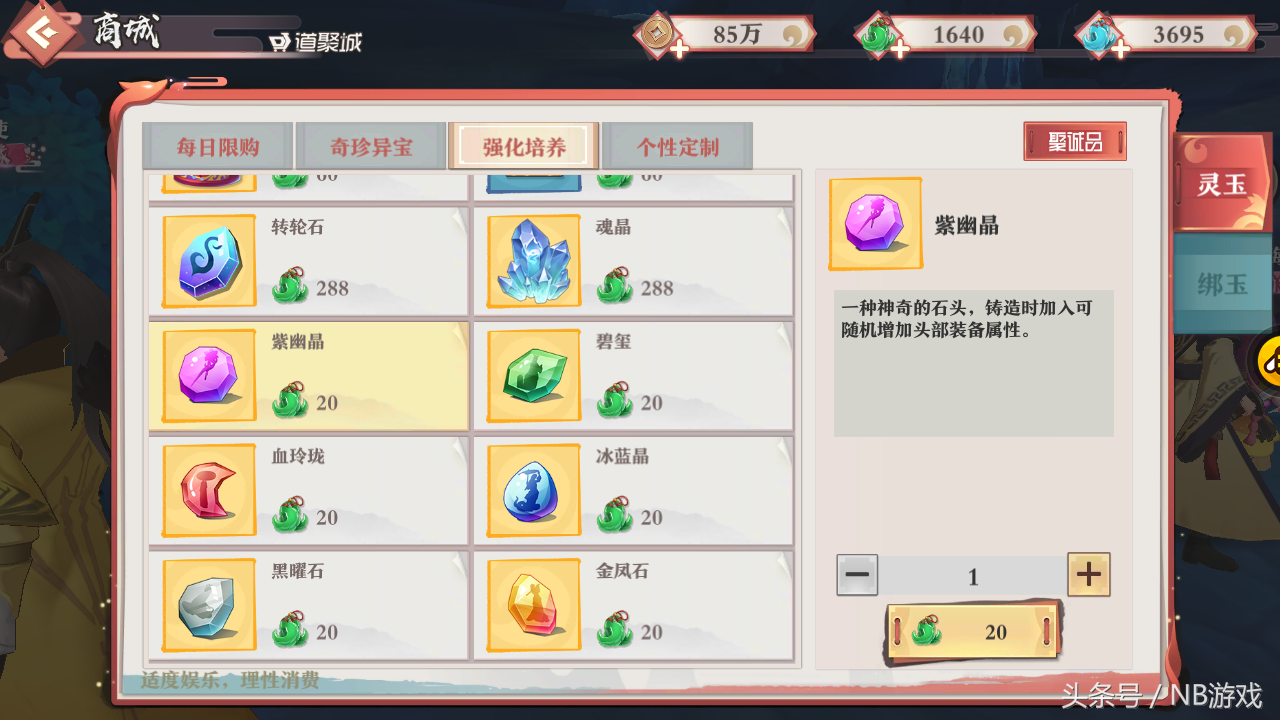 这个材料前期比较稀有,建议直接从商城购买,绑定的灵玉也可以购买。后期的话可以从集市中购买,只要不超过商城的价格。