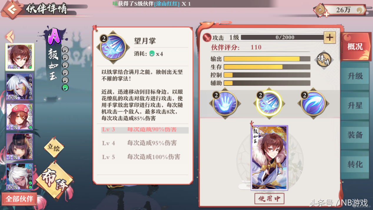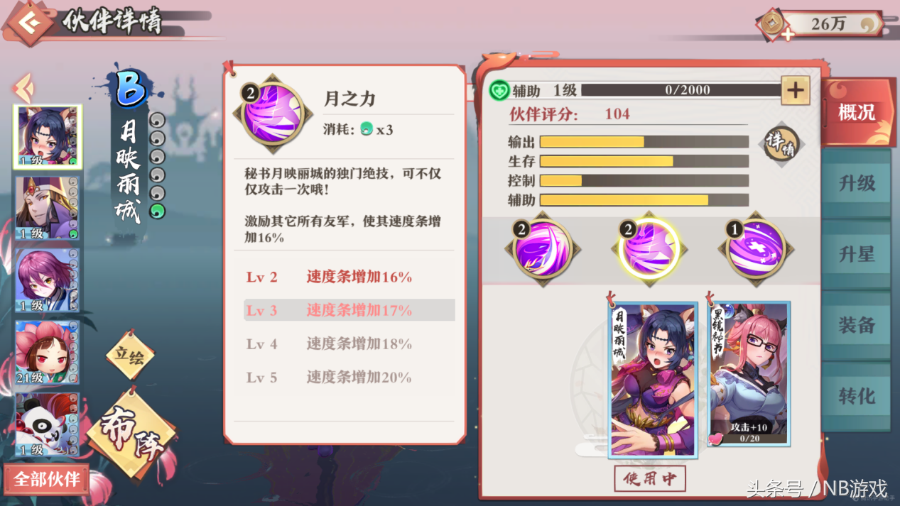 不管怎么说现在的PVP都是靠速度取胜,而作为B级的伙伴月映丽城成了最火的伙伴之一,应该可以说后期每个人必备!除此之外则是需要配置输出位置,比如说金人凤这样的团体输出伙伴,其实也可以用王权富贵,只是培养比较氪金而已,剩下的2个比较随机。