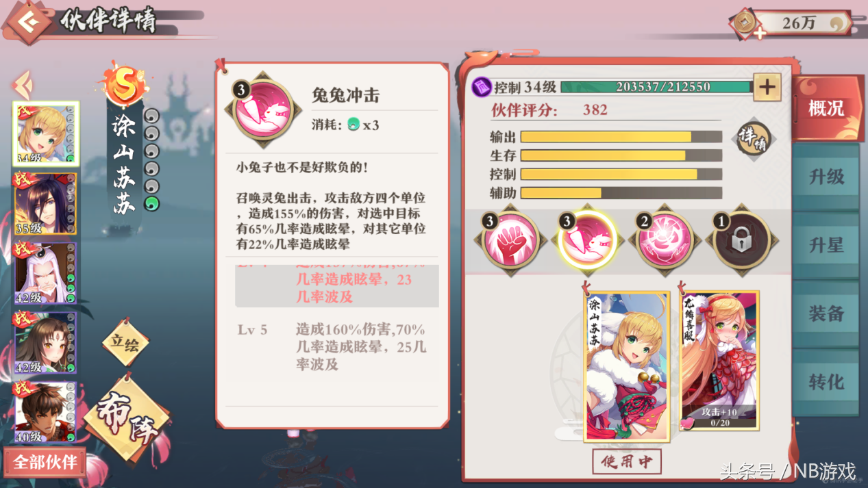 控制流:提起速度之后,可以选择涂山雅雅,涂山苏苏这样的控制型伙伴,后期的效果命中非常高,基本能控制2-3个人,把没有控制的对手伙伴优先击杀,然后通过不断的控制击杀也是可行的!不过没有一波流来的爽快,当然那个是比较氪金或者耗时间培养的!