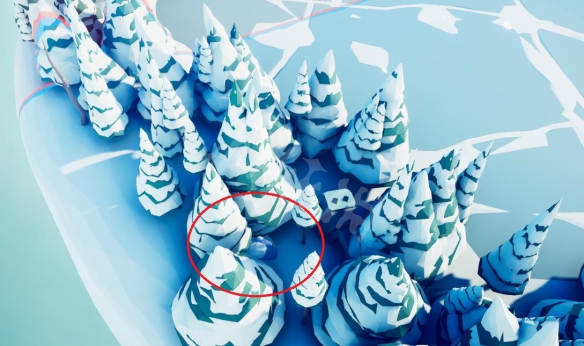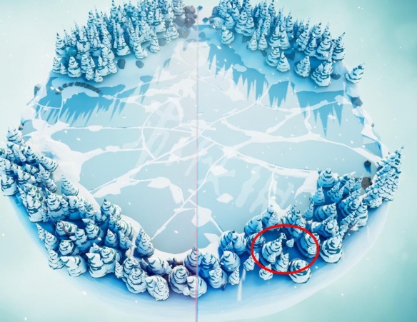 在地图的右下角,冰雪的松树丛中,我们可以发现一个类似冰石头的东西。