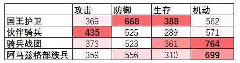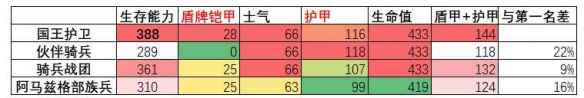 生存能力方面有盾骑兵差异不大,伙伴骑兵因为无盾继续垫底。