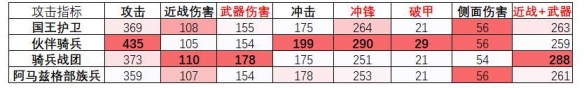 蛮族的骑兵战团有最强的近战害和武器伤害,冲锋能力最低但数值差距并不大。