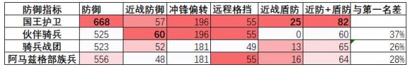 从基础数据来看,罗马国王护卫有两项指标是排名第一,蛮族的骑兵战团有一项排名第一,两项排名第二。