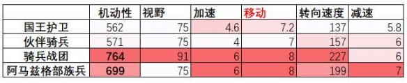 蛮族的骑兵战团机动性优势显著,视野、加速、移动、转向都是第一,是穿插,偷袭,逃跑的首选。