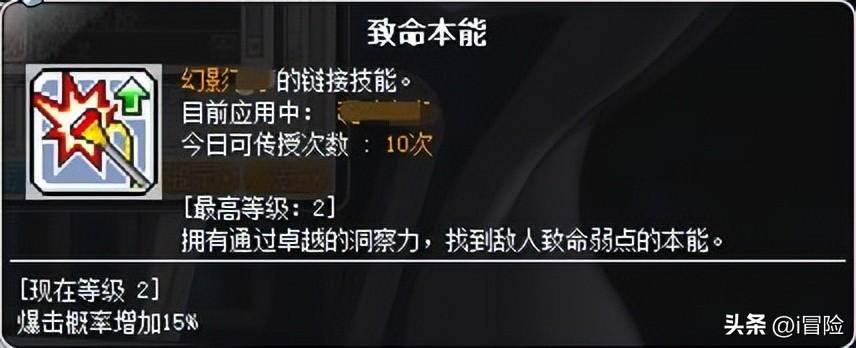 第7个要练的是幻影,他的LINK是暴击率+15%。在你面板0爆伤的状态下,打出暴击伤害是普通伤害的120%-150%,所以面板暴击率堆得越高越好,最好达到100%。他的角色卡加的是金币,没什么用,玩家可以先练到120级就可以了。幻影本身的主攻技能很弱,但好在他的职业特色是可以偷冒险家的技能。一二转可以偷古迹猎人的噬魂和星爆,三转偷主教的花,四转还可以偷圣骑士的圣域,总体上刷怪也还行。