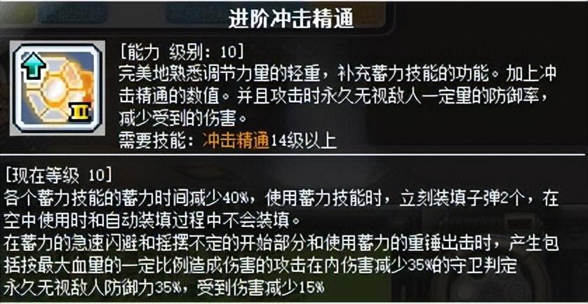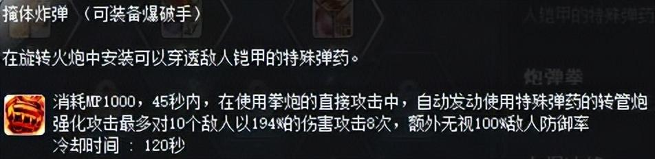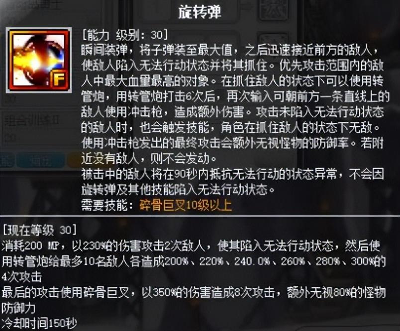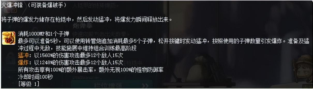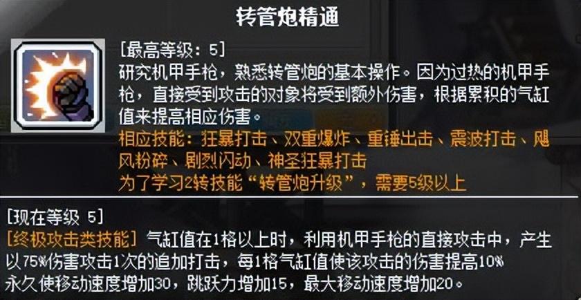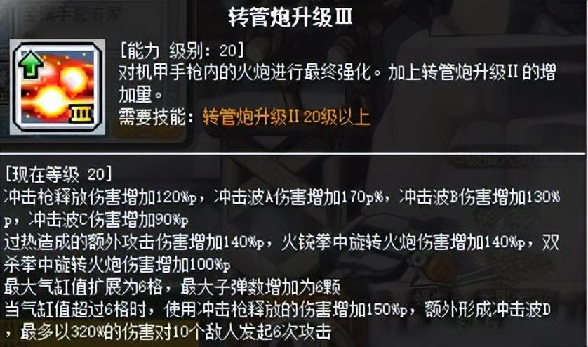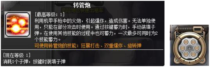 这个技能是一转技能,一转时,武器中只能装填3发子弹,每转职一次该技能就有一次进阶,直到四转学习转管炮升级Ⅲ才能完全装填6发子弹。能填充的最大子弹数量决定弹夹上方的气缸值上限。另外每消耗一发子弹积攒一格气缸值。满(FULL)气缸值时,释放技能伤害就会达到最大。