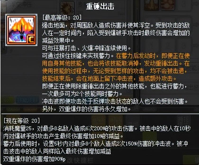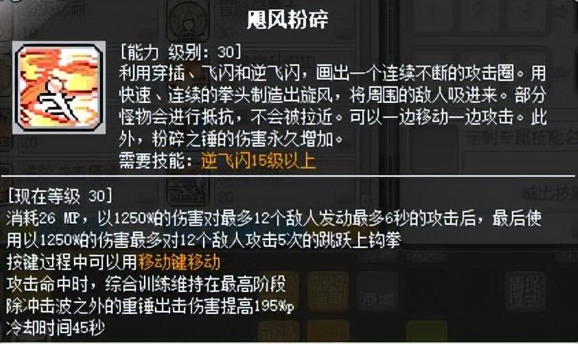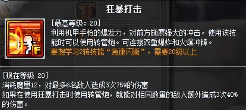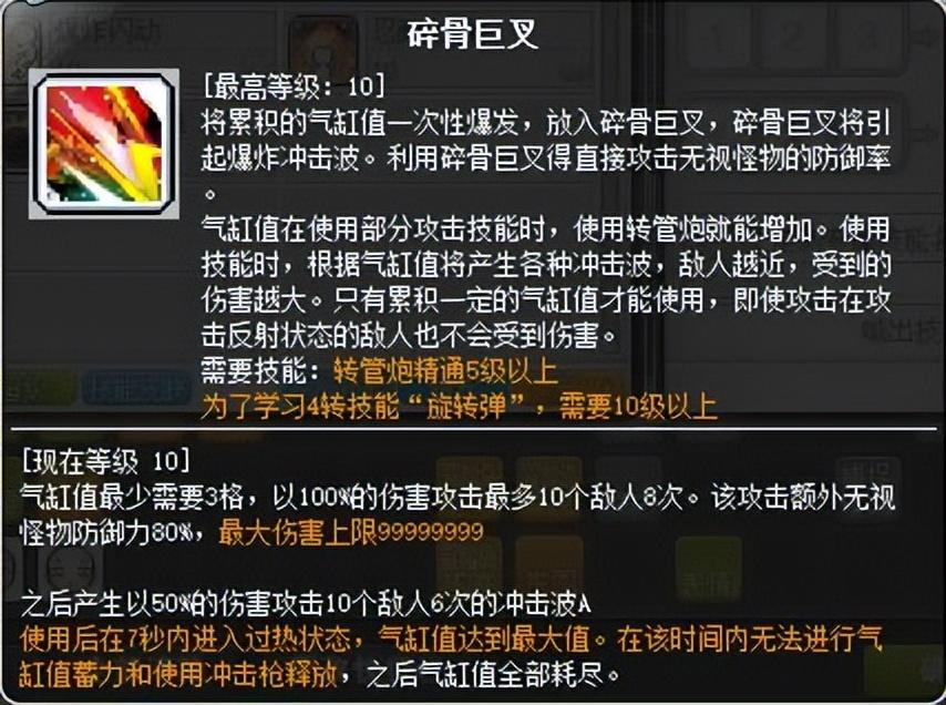 这是个一转技能,该技能是打BOSS过程中的爆发技能,也是前面提到过半屏范围的刷怪神技。气缸值越高,伤害及范围就会越大,四转后才可以达到最大,由于四转前气缸不满,所以用来刷怪也没有很大,所以这个技能前期刷怪升级效率一般,可自行取舍,但是四转后真的用起来很爽。该技能使用时会消耗所有气缸值,消耗之后会有7秒不能填充,这个需要注意。